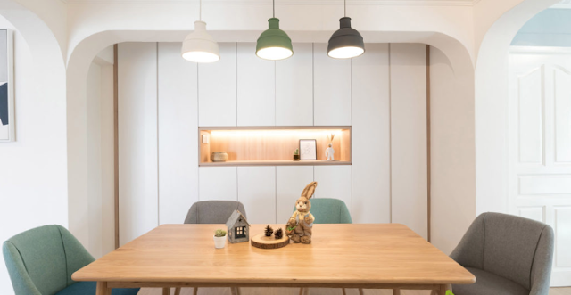 The dining space is one area where you can let your imagination fly for luxury bungalow interiordesign. Enjoy a subcaste layer of oomph with an innovative dining set. As shown in the picture below, the home has a custom-made sword dining table set with chairs. If you look closely, the breakfast bar droppings are also made following the same design as the dining nearly. The dining area is illuminated with swish reversed Y-shaped pendant lights.